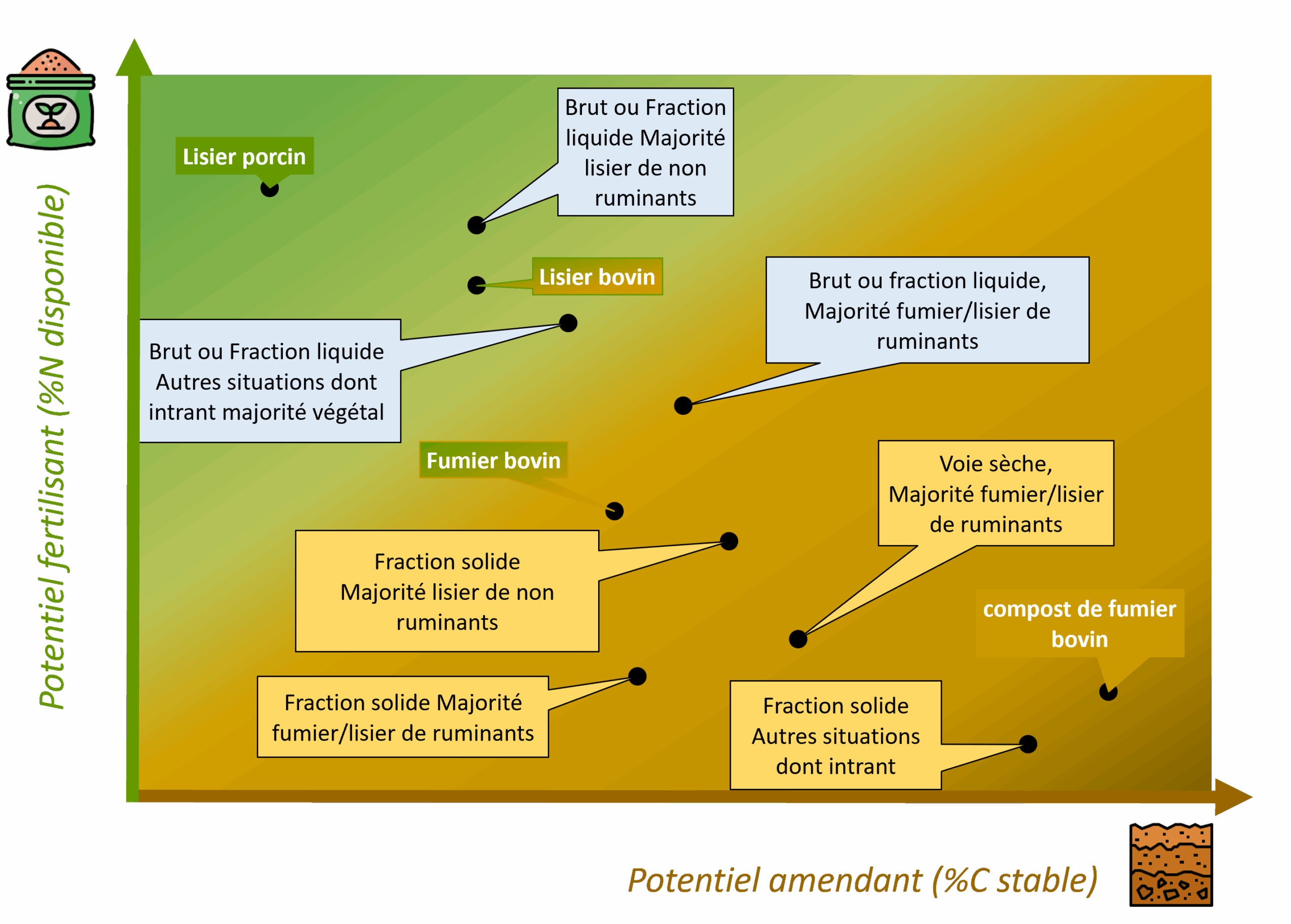 En positionnant l’ensemble des classes de digestats par rapport à d’autres produits résiduaires organiques au regard de leur effet fertilisant (traduit par l’azote disponible, correspondant à la somme des fractions de l’azote minéral et de l’azote organique minéralisable à court terme) et de leur effet amendement (traduit par la fraction du carbone stable), il apparaît que la typologie impacte les propriétés agronomiques des digestats.